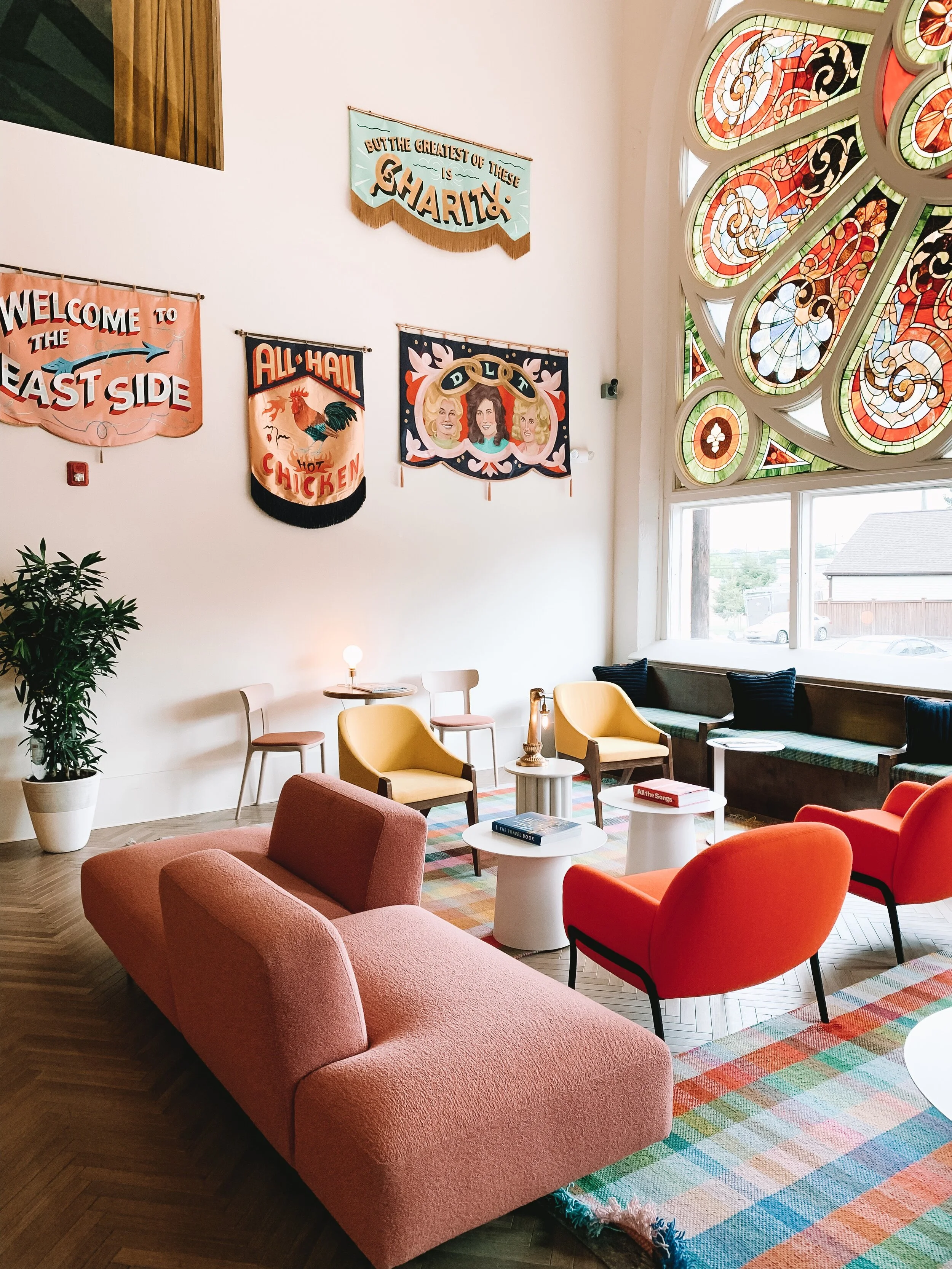 Previously a church in the East Nashville area, The Russell is a boutique hotel that has been redeveloped to incorporate the original charm of its history. With use of the old pews as headboards and 100+ year old restored stained glass windows, this hotel offers a unique experience that offsets it from the other lodging options in Nashville. Here we live by the slogan “Stay here, change lives” because we give away the majority of our profits to help underserved communities. We are proud to say that the character and heart of this property is unmatched in Nashville.